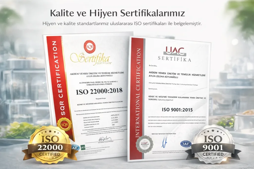 Üretim süreçlerimizde gıda güvenliği ve kalite standartları en üst seviyede tutulmaktadır. Firmamız, uluslararası kalite yönetim standartlarına uygun olarak faaliyet göstermekte olup ISO 22000:2018 Gıda Güvenliği Yönetim Sistemi ve ISO 9001:2015 Kalite Yönetim Sistemi sertifikalarına sahiptir. Bu sertifikalar, üretimden servise kadar tüm süreçlerde hijyen, güvenilirlik ve sürdürülebilir kalite anlayışıyla çalıştığımızın önemli bir göstergesidir.